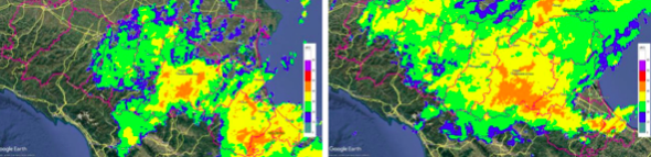Mappa di riflettività del composito radar alle 01:00 e alle 9:35 (ora locale) del 24/12/2025.